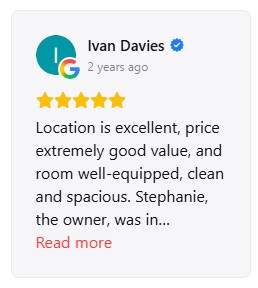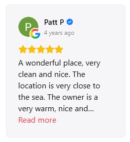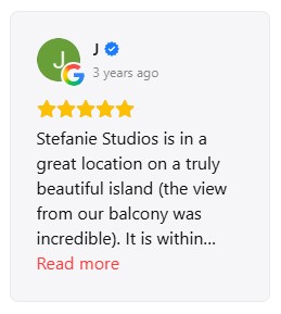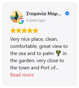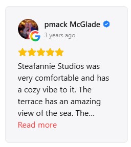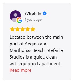 The guest experience is for us the best confirmation of the hospitality we offer at Stefanie Studios & Apartments. Many travelers who have chosen our accommodation for their stay in Aegina have shared their impressions through the largest travel platforms, such as Google and Booking. These reviews reflect the guest experience regarding the cleanliness, location, view, comfort of the spaces and the hospitality offered by the accommodation. Through their comments you can see what stands out from those who have already visited Stefanie Studios and get a more complete picture of the accommodation that awaits you. Below you can see some snapshots of reviews from Google and Booking, where guests share their experience of their stay at the accommodation and their visit to the beautiful island of Aegina. |